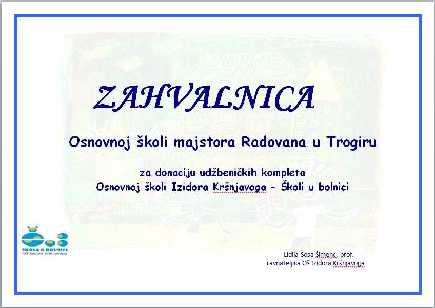 Svečana proslava desete godišnjice rada Škole u bolnici OŠ Izidora Kršnjavoga održala se 27. siječnja u Satiričkom kazalištu Kerempuh. Ravnatelj naše škole prisustvovao je ovoj svečanosti gdje mu je uručena zahvalnica za donaciju udžbeničkih kompleta. Ovom donacijom pomogli smo bolesnim učenicima da su ukorak stjecanju znanja sa svojim vršnjacima. Hvala svim učenicima, roditeljima i djelatnicima naše škole na trudu i empatiji za druge.